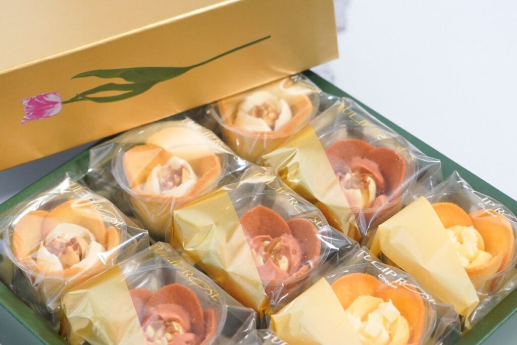 フランス産発酵バター香るサクサクのラングドシャクッキーでかたどったチューリップの中に、とろける生食感クリームのローズが咲き誇る、話題の映えスイーツ。箱を開けた瞬間にときめく、まるでブーケみたいな贈り物です。